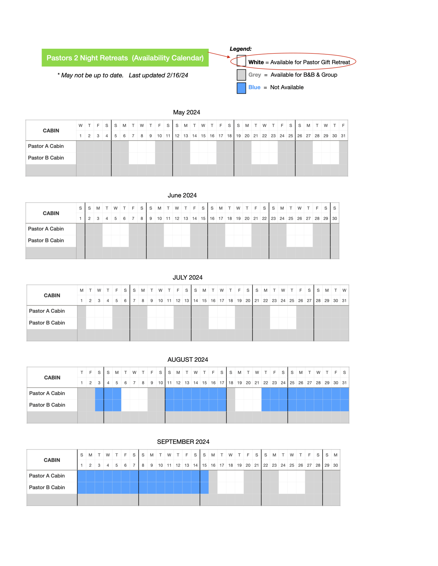 On the calendar, the dates reserved for Pastoral Retreat gift cards are represented in white, these days include meal service. There is room to book two Pastoral couple each in thier own cabin. Gray areas on the calendar represent days that may be available for a fee if you wish to extend your stay. Blue areas on the calendar are days that are booked. IMPORTANT: We try to keep the calendar up to date but may not reflect recent bookings.